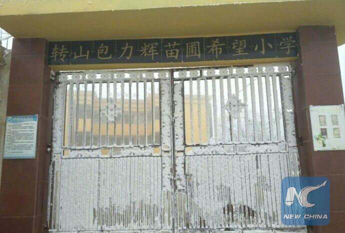 The gate of Zhuanshanbao Primary School is covered in ice. (web photo)