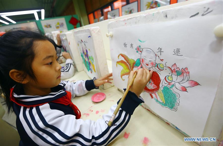 A girl learns to paint new year picture at Puyu School in north China's Tianjin Municipality, Jan. 3, 2018. Intangible cultural heritage lessons, such as Yangliuqing new year painting, paper cutting and traditional drum performance, were introduced into the school. (Xinhua/Liu Dongyue)