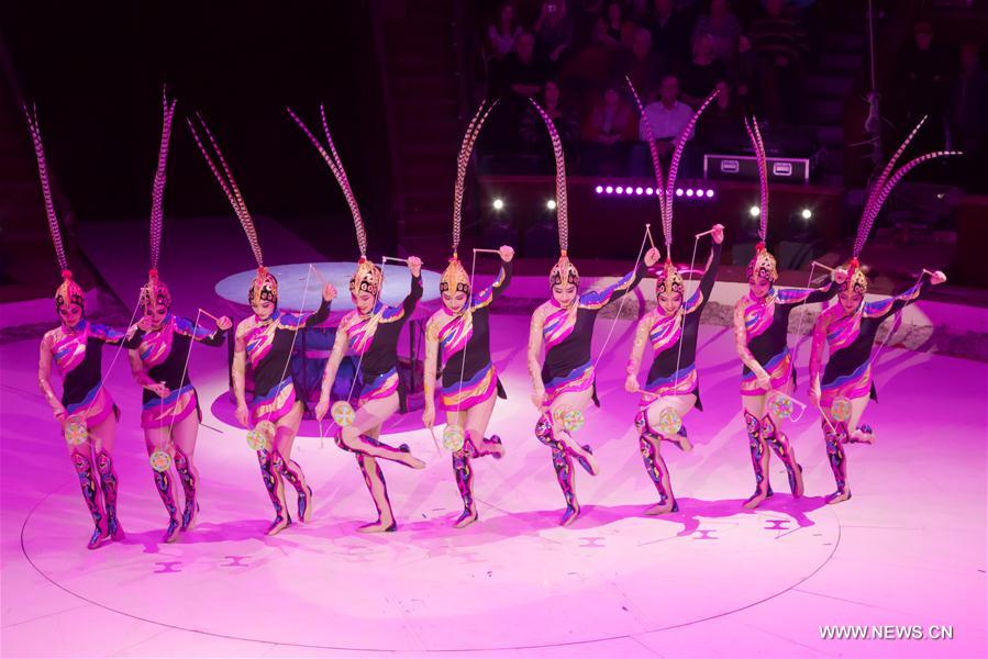 Members of the Chinese National Acrobatic Troupe perform diabolo act during the 12th Budapest International Circus Festival in Budapest, Hungary, on Jan. 14, 2018. The Chinese National Acrobatic Troupe and the Mongolian Nomuna Troupe won the first prize at the 12th Budapest International Circus Festival Sunday. (Xinhua/Attila Volgyi)