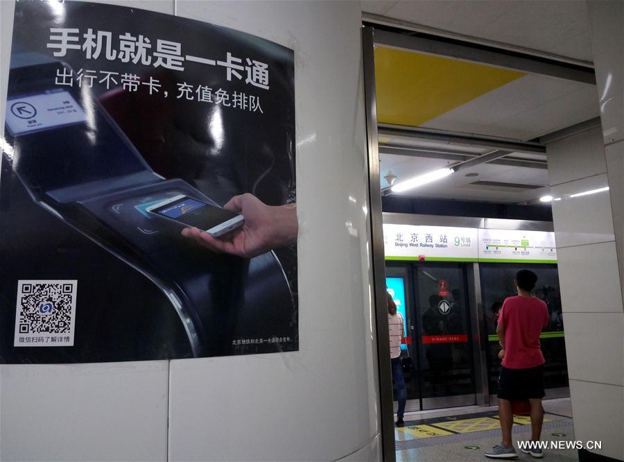 Passengers wait for the train at a metro station in Beijing, capital of China, Aug. 14, 2017. Passengers can simply swipe their phones to board all of Beijing's subway lines starting Monday, local authorities said. According to Beijing Subway, riders with compatible phone models may download an app to take the subway and recharge their e-tickets online. Currently, the e-tickets are limited to around 160 Android phone models with near field communication (NFC) function. (Xinhua/Du Jianpo)