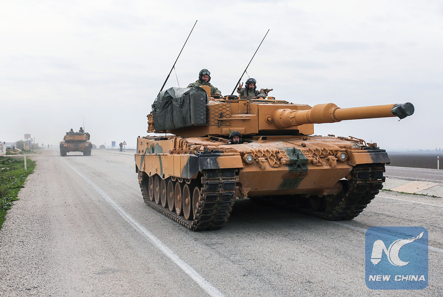 Turkish armored vehicles run near the Syrian-Turkish border at Reyhanli district in Hatay, Turkey, on Jan. 21, 2018. (Xinhua)
