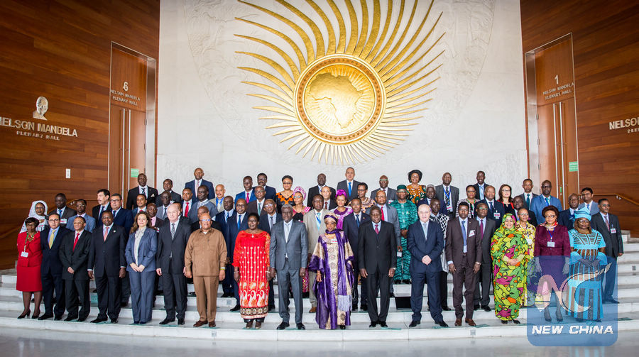Delegates take group photo after the 35th Ordinary Session of the Permanent Representatives' Committee on Jan. 22, 2018. (Xinhua/Lyu Shuai)