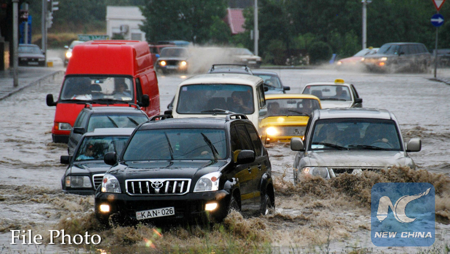 Cars drive in a street flooded by heavy rain in central Tbilisi on June 29, 2008. (AFP PHOTO)