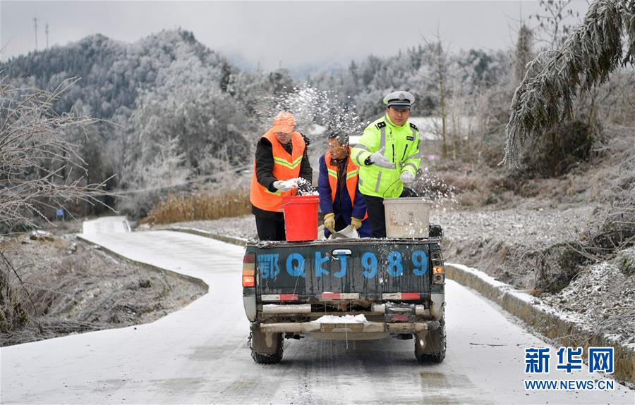A policeman from Baiguo police station, Enshi City, central China’s Hubei Province, helps scatter snowmelt agent over the road, Jan. 27, 2018. (Xinhua/Yang Shunpi)