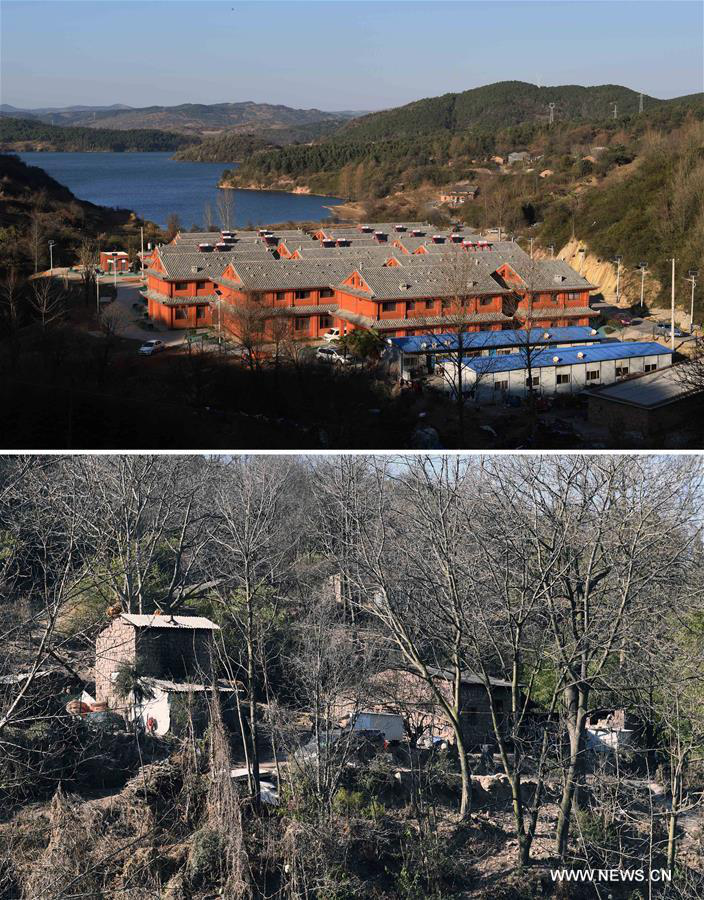 Combo photo taken on Jan. 15, 2018 shows the newly-built Luoxiaocun Village of Miao ethnic group (top) and the house the villagers used to live in Qujing, southwest China's Yunnan Province. People of Miao ethnic group who didn't have household registration certificates have been immigrated to the new village since 1983. The government helped 110 people to get household registration certificates which guaranteed their rights in healthcare, education and pension in recent years. The Luoxiaocun Village of Miao ethnic group also improved its infrastructure and alleviated poverty by breeding chicken, goat and bee. (Xinhua/Yang Zongyou)