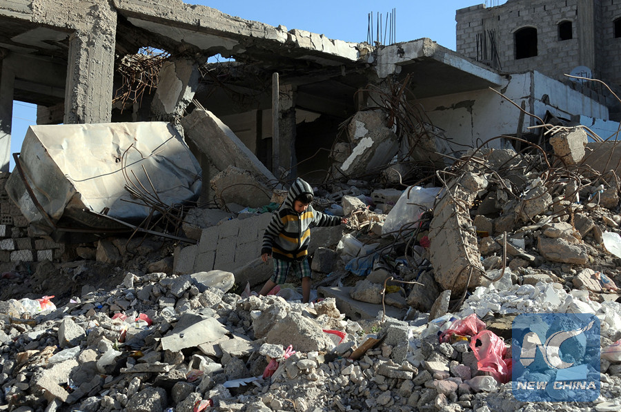 A boy walks on rubble of a house destroyed by recent airstrikes carried out by the Saudi-led coalition in Sanaa, Yemen, on Dec. 29, 2017.(Xinhua Photo)