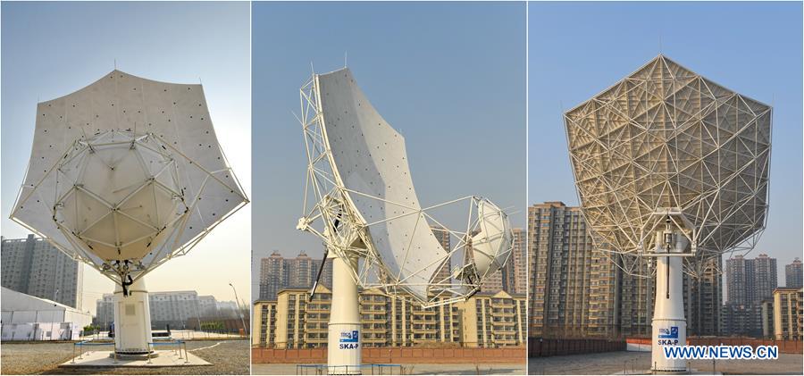 Combined photo taken on Feb. 6, 2018 shows the frontage (L), sideview (C) and the backside of the prototype dish for Square Kilometer Array (SKA) radio telescope. The first fully assembled dish for the SKA radio telescope was unveiled Tuesday in Shijiazhuang, capital of north China's Hebei Province. The SKA, an international effort to build the world's largest radio telescope using arrays in Australia and South Africa, is not a single telescope, but a collection of telescopes or instruments, called an array, to be spread over long distances. (Xinhua/Mu Yu)