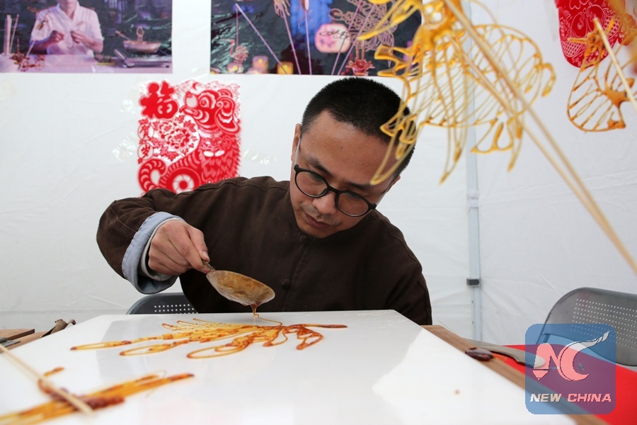 A Chinese artist performs sugar painting skill at a temple fair in Athens, Greece, on Feb. 10, 2018. Greeks joined their Chinese friends living in Athens on Saturday in celebrations ahead of the Chinese New Year, or SpringFestival. Under the theme "Night of Beijing", artists from the Opera, Dance Academy and National Orchestra of Beijing, along with other troupes, performed traditional dances, theater plays, acrobatics and Chinese martial arts, enthralling the audience. (Xinhua/Marios Lolos)