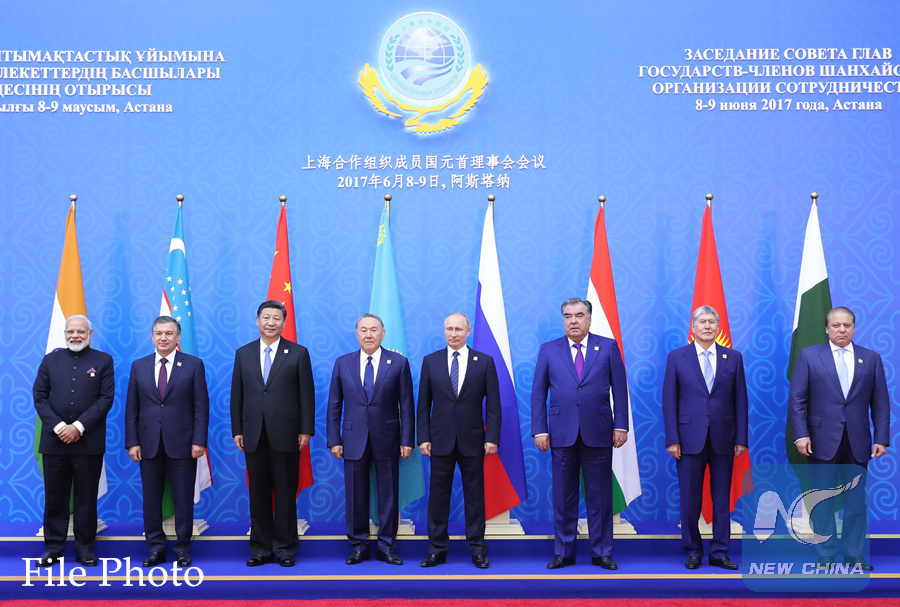 Chinese President Xi Jinping (3rd L), leaders of other Shanghai Cooperation Organization (SCO) member states and prime ministers of India and Pakistan pose for a group photo during the 17th meeting of Council of Heads of State of the Shanghai Cooperation Organization (SCO) in Astana, Kazakhstan, June 9, 2017. (Xinhua/Ma Zhancheng)