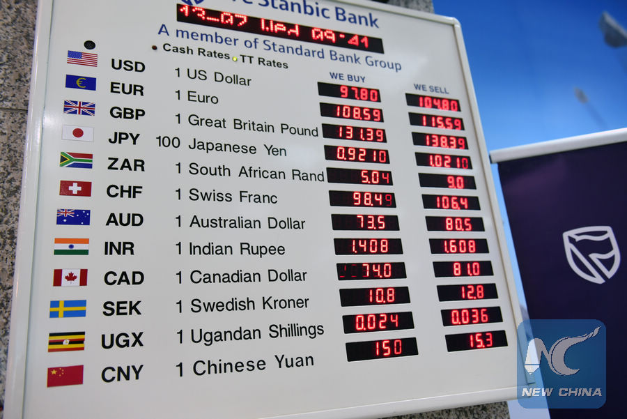Photo taken on July 13, 2016 shows the exchange rates of foreign currencies against the Kenyan Shilling at the headquarter of Kenya's CFC Stanbic Bank in Nairobi, capital of Kenya. (Xinhua/Li Baishun)