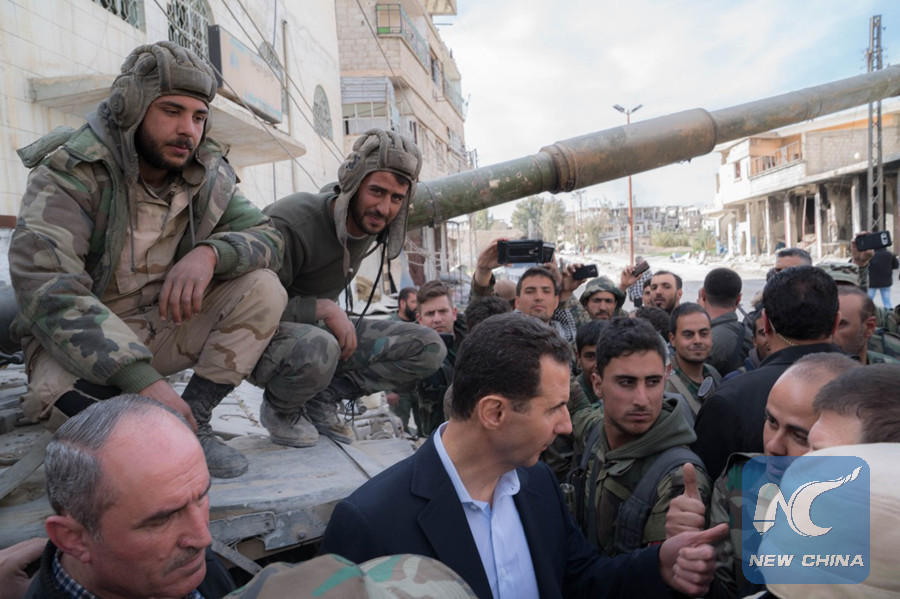DAMASCUS, March 18 (Xinhua) -- Syrian President Bashar al-Assad on Sunday visited a frontline area in Damascus' Eastern Ghouta area, where the Syrian army is advancing against the rebels, the Syrian presidency media office said.