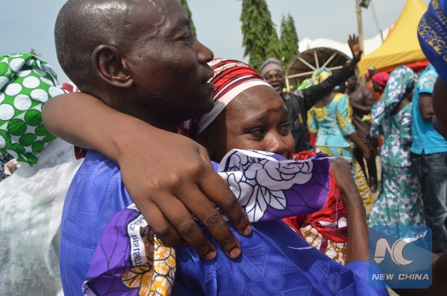 File photo shows a Chibok girl (R) released from terror group Boko Haram's captivity hugs her relative in Abuja, Nigeria, May 20, 2017.(Xinhua/Olatunji Obasa)