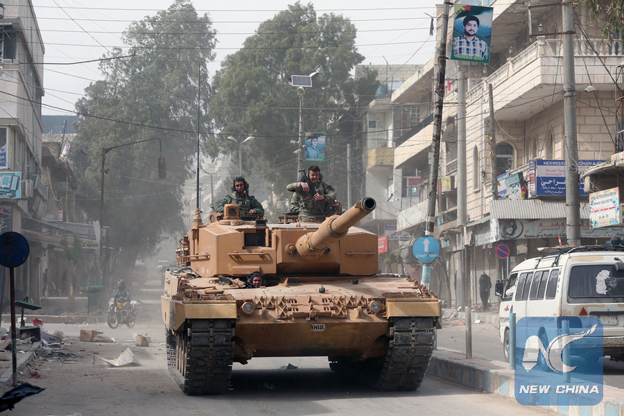 A Turkish military tank advances on a street in Afrin, Syria, on March 24, 2018. (Xinhua)