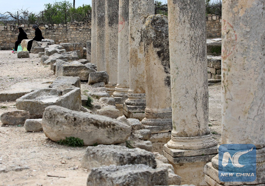 Palestinian women seen during their visit to the Roman historical site of Sebastia village, north of the West Bank city of Nablus, on March 22, 2017. (Xinhua photo)