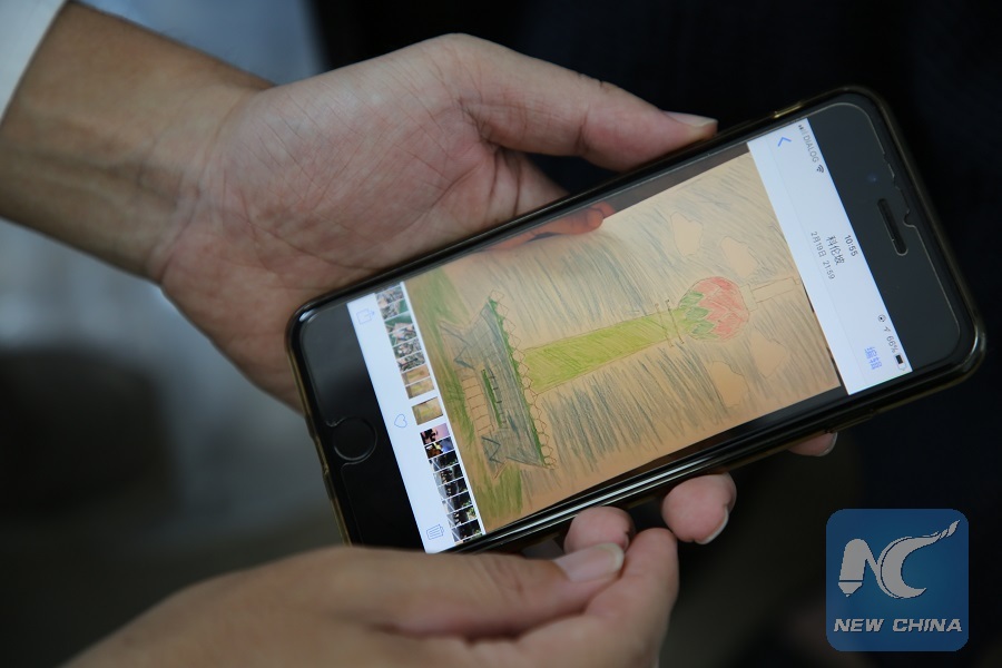 Photo taken on March 31, 2018 in Colombo, Sri Lanka shows a crayon sketch of the Colombo Lotus Tower, drawn by project manager Cai Xiaofeng's daughter, is treasured in his mobile phone.