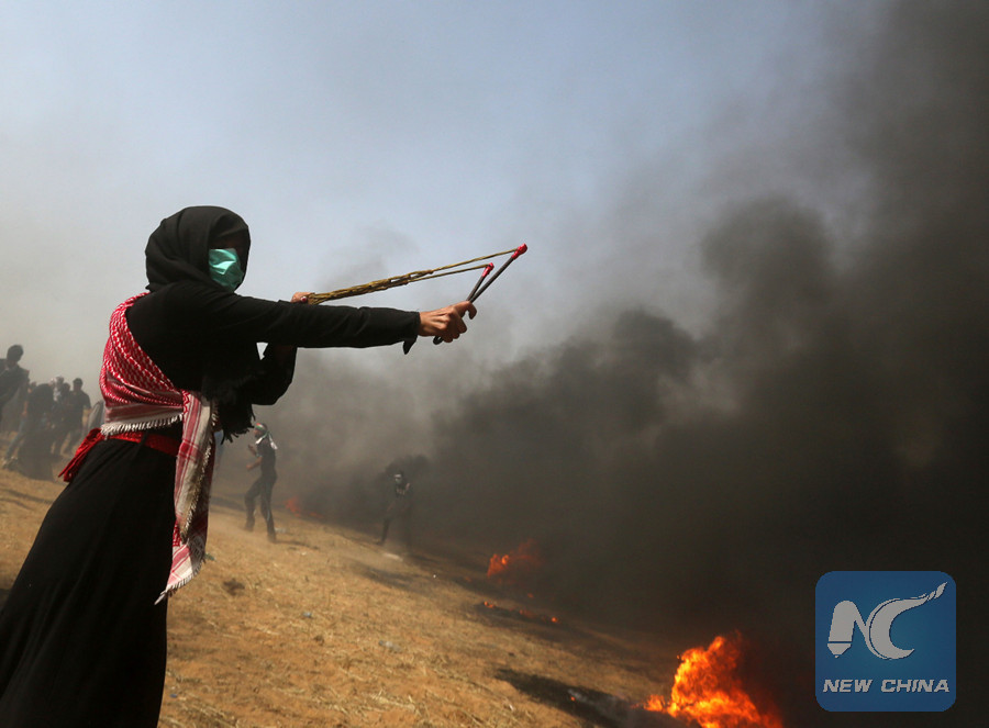 GAZA, April 13 (Xinhua) -- In a rare scene, Palestinian women were on front lines during Friday confrontations with Israeli soldiers along the Gaza-Israel borders.