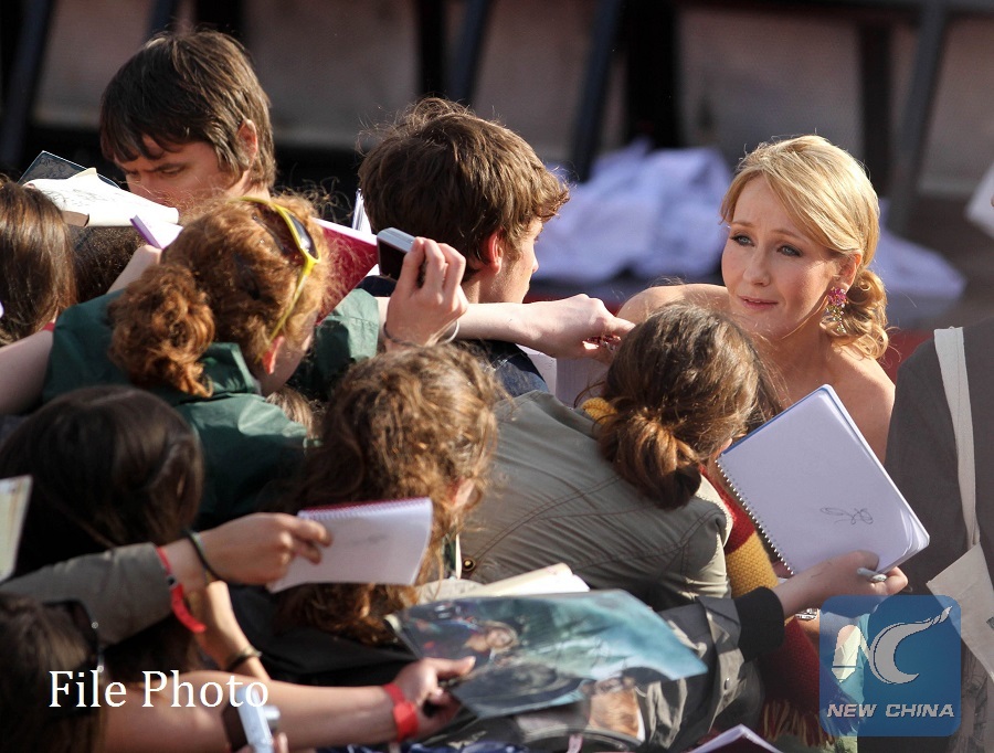 Author J.K. Rowling signs autographs for fans during the global premiere of Harry Potter and The Deathly Hallows: Part 2, the last film of the series, at Trafalgar Square in London, Britain, July 7, 2011. (Xinhua/Yang Xiaohan)