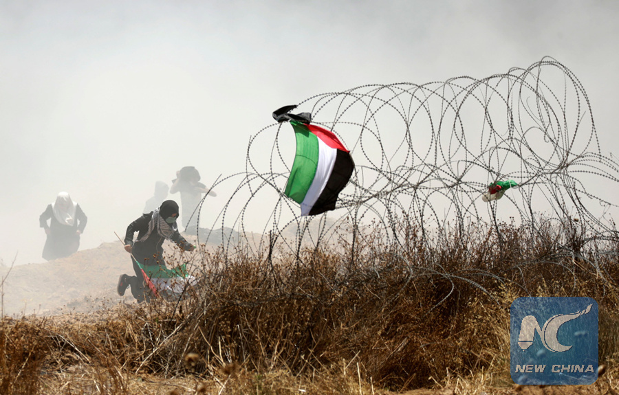 A Palestinian protester holding his national flag runs past barbed wires during clashes with Israeli forces near the border between the Gaza strip and Israel east of Gaza City on May 14, 2018. (AFP PHOTO)