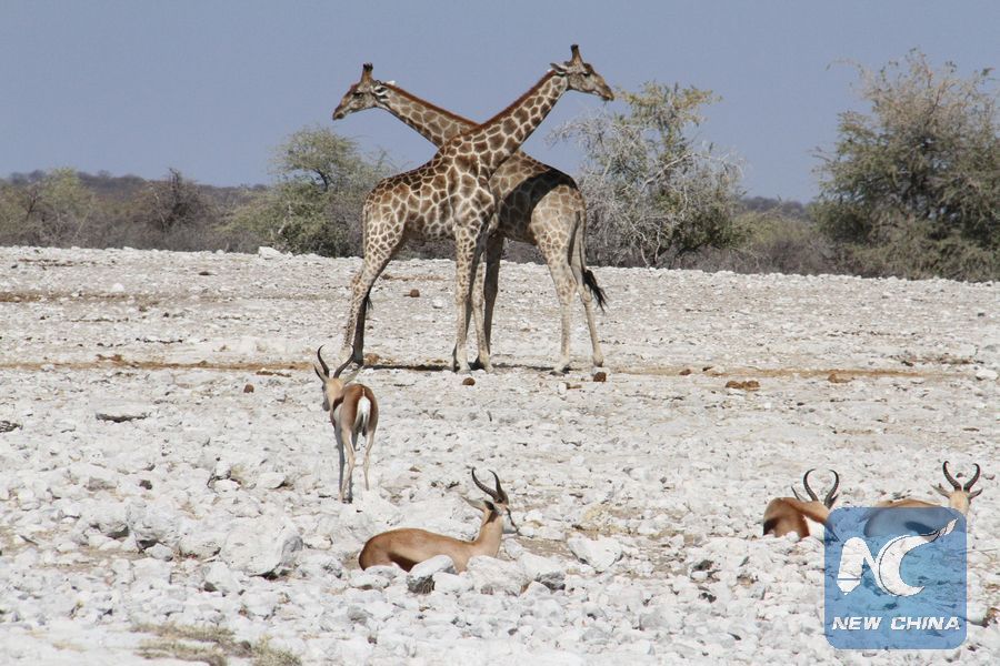 Giraffes and steenboks are seen at the Etosha National Park, northwestern Namibia, July 30, 2016. The park spans an area of 22,270 square kilometers and gets its name from the Etosha pan, a large salt pan. The park is home to hundreds of species of mammals, birds and reptiles. (Xinhua/Wu Changwei)