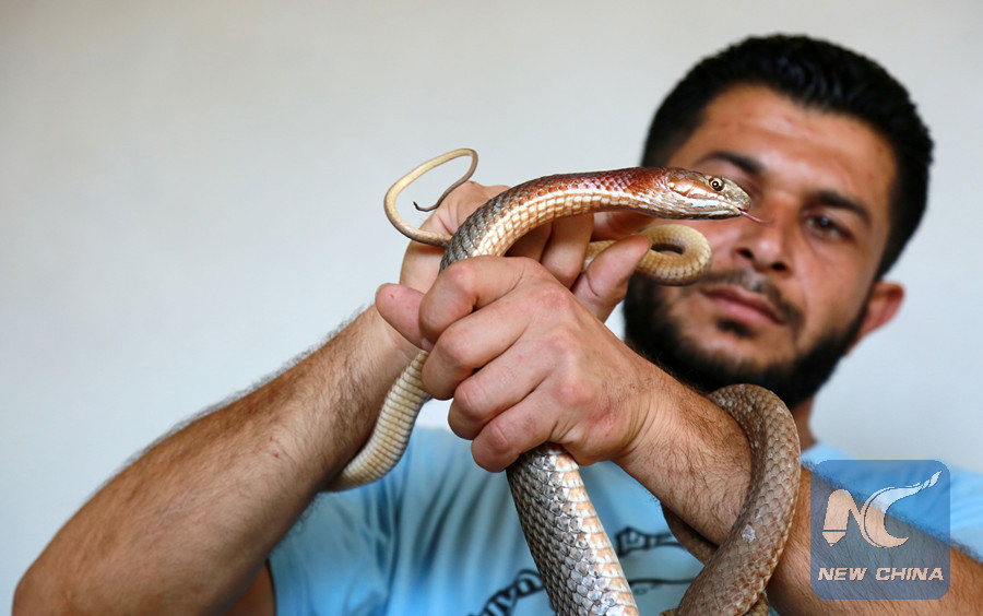 GAZA, June 22 (Xinhua) -- Abdul-Fattah Assaliya, a 32-year-old man in the Palestinian enclave of the Gaza Strip, spends most of his time every day caring for the 35 snakes at his home.