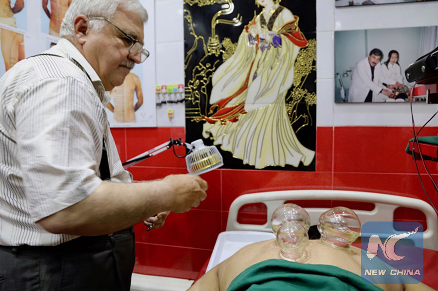 Iraqi physician Sabah al-Mustwfi is using cupping therapy for treatment in his clinic in Baghdad on June 14, 2018. (Xinhua)
