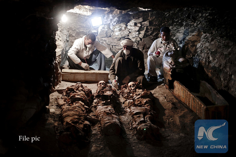 Archaeologists work on mummies found in the New Kingdom tomb in Luxor, Egypt, on Sep. 9, 2017. (AP photo)