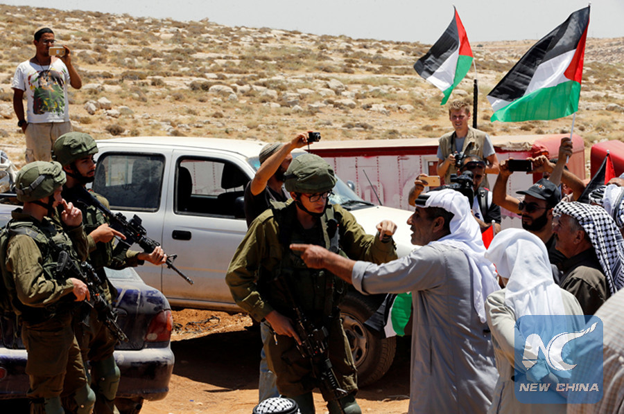 A Palestinian man argues with an Israeli soldier during a protest against a new Jewish settlement outpost near Hebron in the occupied West Bank on June 26, 2018. (REUTERS)
