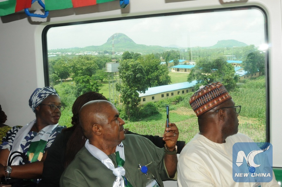 Passengers look outside of the window while taking a ride on the train in Abuja, Nigeria, July 12, 2018. (Xinhua/Zhang Baoping)