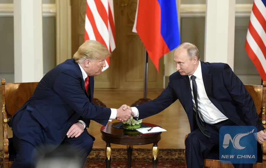 U.S. President Donald Trump (L) shakes hands with his Russian counterpart Vladimir Putin in Helsinki, Finland, on July 16, 2018. (Xinhua/Lehtikuva/Heikki Saukkomaa)