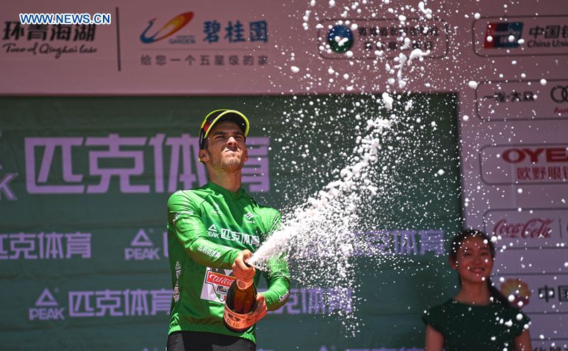 Luca Pacioni from Italian Wilier Triestina - Southeast Team(WIL) celebrates with the green jersey, at the award ceremony of the fourth stage of the Tour of Qinghai Lake in northwest China's Qinghai Province, on July 25, 2018. (Xinhuanet Photo by Yang Shoude)