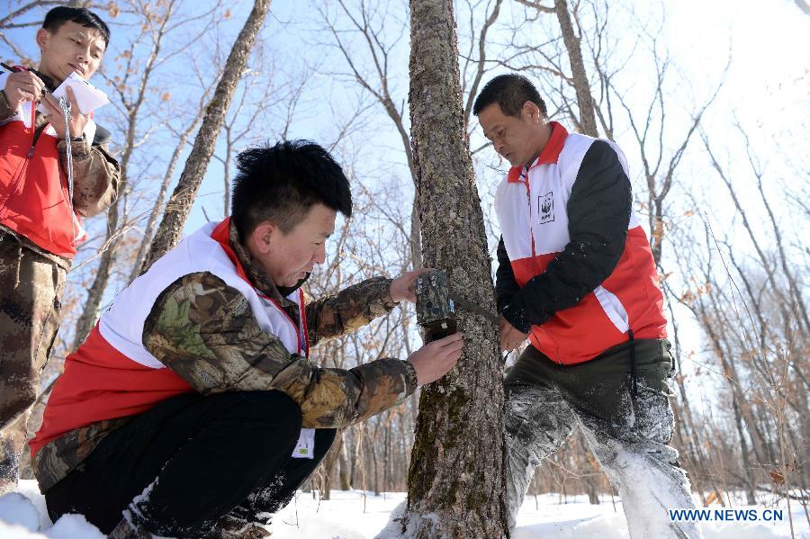 Tiger conservation experts set up an infrared camera during a Siberian tiger conservation skill contest in Suifenhe, northeast China's Heilongjiang Province, March 5, 2018. (Xinhua/Wang Kai)