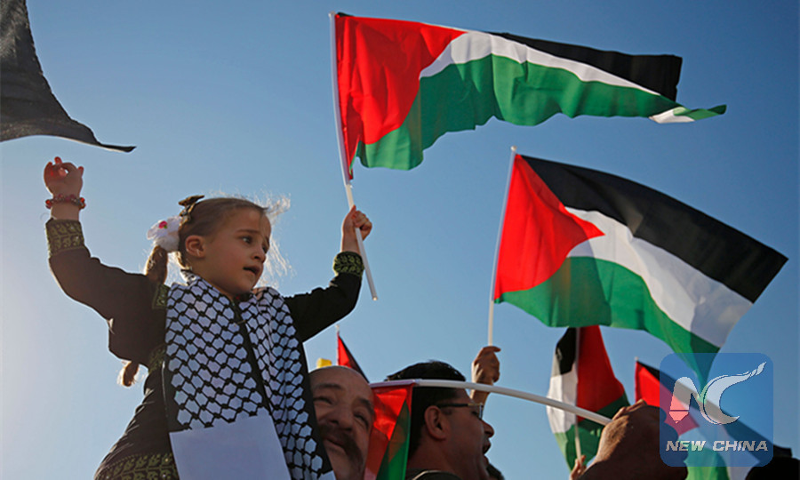 Palestinians wave their national flag as they demonstrate in support of bedouin inhabitants near their village of Khan al-Ahmar, in the occupied West Bank July 18, 2018. (AFP photo)