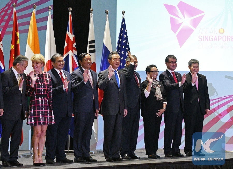 Chinese State Councilor and Foreign Minister Wang Yi (C) poses for a group photo during the 8th foreign ministers' meeting of the East Asia Summit held in Singapore, Aug. 4, 2018. (Xinhua/Then Chih Wey)