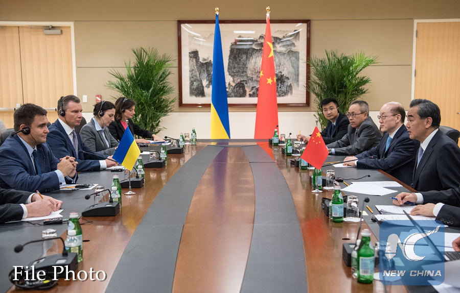 Chinese Foreign Minister Wang Yi (1st R) meets with his Ukrainian counterpart Pavlo Klimkin (1st L) in New York, the United States, on Sept. 18, 2017. (Xinhua/Li Rui)
