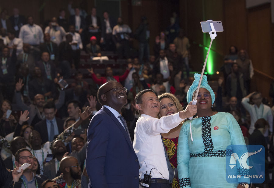Chinese Alibaba's Chairman Ma Yun (2nd L) takes a selfie with honor guests during the conference "The Rise of Africa's Digital Lions" in Johannesburg, South Africa, on Aug. 8, 2018. (Xinhua/Chen Cheng)