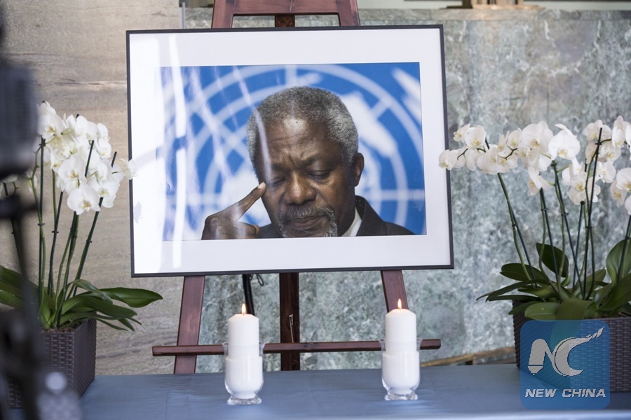 Candles are lit in front of the portrait of former UN Secretary General Kofi Annan during a memorial ceremony at Palais des Nations, in Geneva, Switzerland, Aug. 20, 2018. (Xinhua/Xu Jinquan)