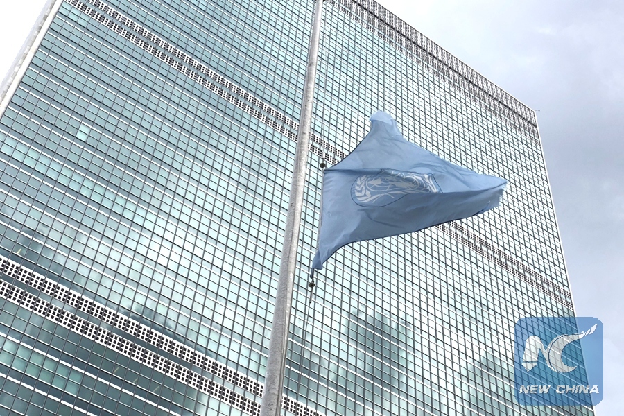 The United Nations flag flies at half mast in memory of the late former UN Secretary-General Kofi Annan, at the UN headquarters in New York, on Aug. 18, 2018. (Xinhua/Li Muzi)
