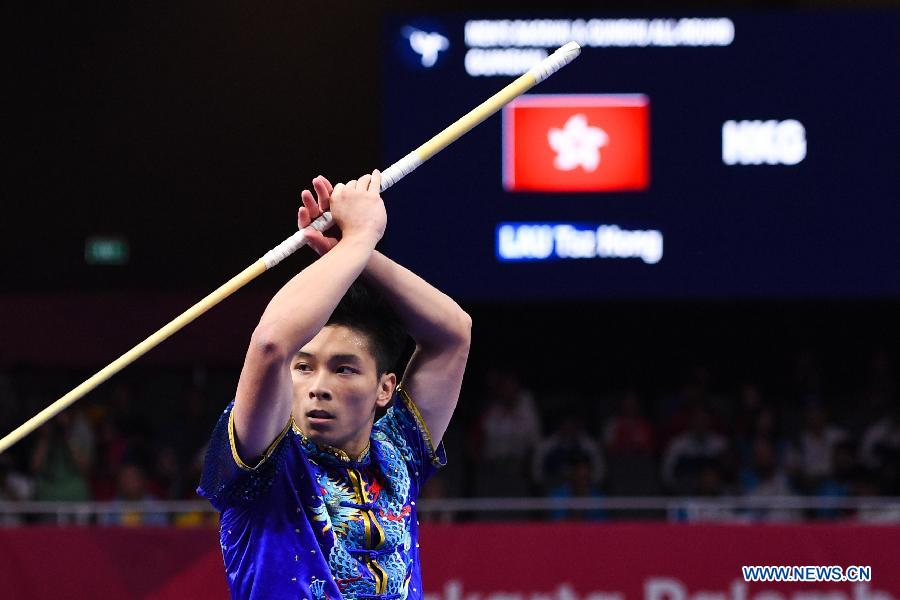 ?Lau Tsz Hong of China's Hong Kong competes during the Gunshu competition of Men's Daoshu & Gunshu All-Round at the 18th Asian Games in Jakarta, Indonesia, Aug. 21, 2018. (Xinhua/Cheong Kam Ka)