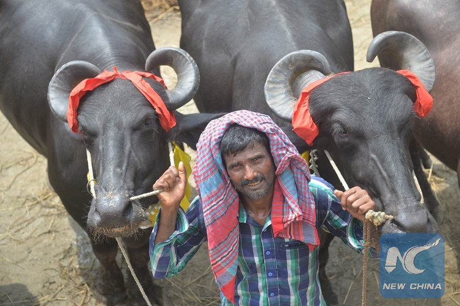 A man poses with his cattle ahead of the annual Eid al-Adha festival at a market in Dhaka,Bangladesh on Aug. 18, 2018. (Xinhua)