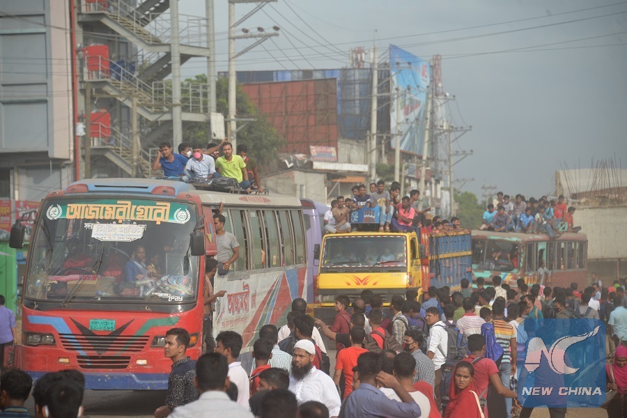 Homebound travelers travel on buses and trucks in Dhaka, Bangladesh, on Aug. 20, 2018, during the Eid al-Adha festival. (Xinhua)