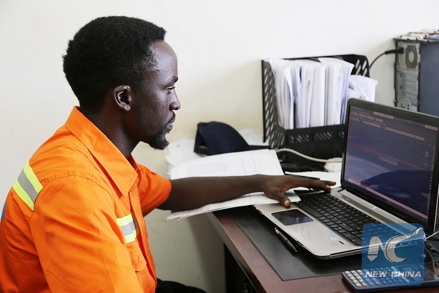 Local engineer Andrew Kamagara works at the office of the Karuma Hydro Power Project in the midwestern district of Kiryandongo, Uganda, on Aug. 2, 2018. (XinhuaZhang Gaiping)