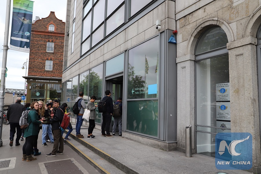 Photo taken on Sept. 10, 2018 shows people lining up at the entrance of the Irish Naturalization and Immigration Service building in Dublin, Ireland. (Xinhua)