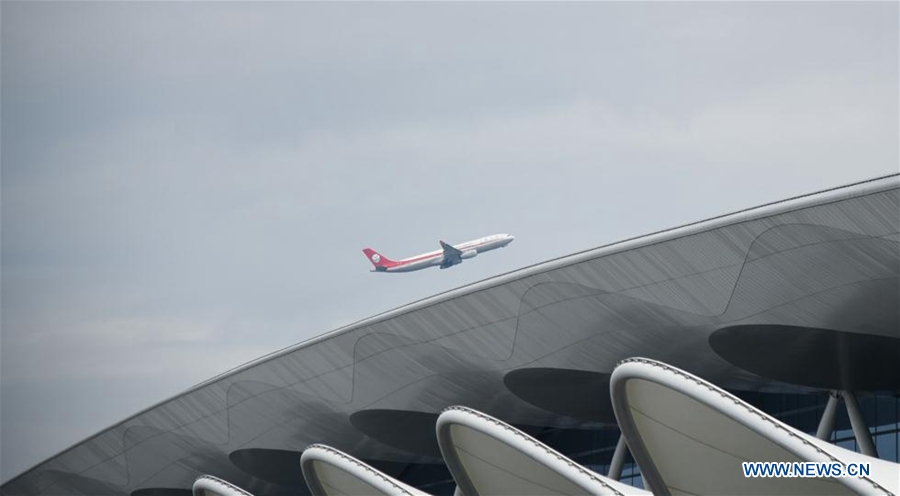 An aircraft flies over Terminal 2 of Guangzhou Baiyun International Airport in south China's Guangdong Province, Sept. 12, 2018. (Xinhua/Deng Hua)
