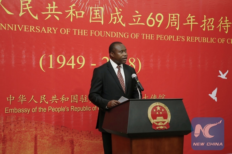 Rwandan Finance Minister Uzziel Ndagijimana addresses the reception celebrating the 69th anniversary of the founding of the People's Republic of China, in Kigali, capital of Rwanda, on Sept. 19, 2018. (Xinhua/Lyu Tianran)