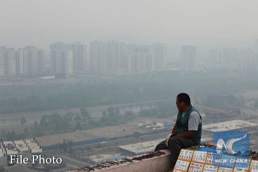 Photo taken on July 16, 2017 shows the city of Ulan Bator covered in smog which was caused by severe forest fires in Mongolia. (Xinhua/Asigang)
