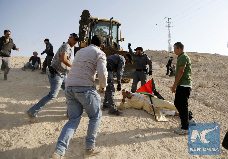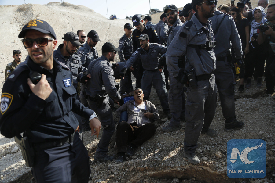 Israel forces detain activists at the Palestinian Bedouin community of Al-Khan Al-Ahmar that Israel plans to demolish, located between the West Bank city of Jericho and Jerusalem, on Oct. 15, 2018. (Xinhua/Mamoun Wazwaz)