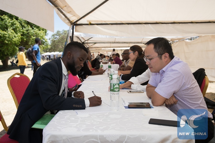 Representatives of Chinese enterprises talk with job seekers during a jobs expo at the University of Zambia in Lusaka, Zambia, Oct. 26, 2018. (Xinhua/Peng Lijun)