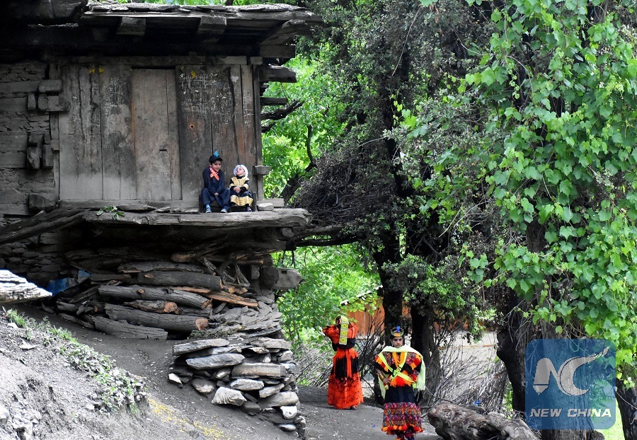 Kalash children play outside their home in Kalash Valley in northwest Pakistan's Chitral District on May 14, 2018. (Xinhua/Saeed Ahmad)