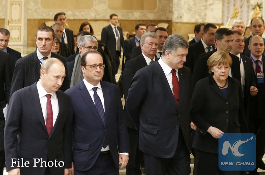 Russian President Vladimir Putin, Franch President Francois Hollande, Ukrainian President Petro Poroshenko and German Chancellor Angela Merkel (front L-R) attend a meeting aimed at halting a war in Ukraine at the presidential residence in the Ukranian capital of Minsk on February 11, 2015. (AFP PHOTO)