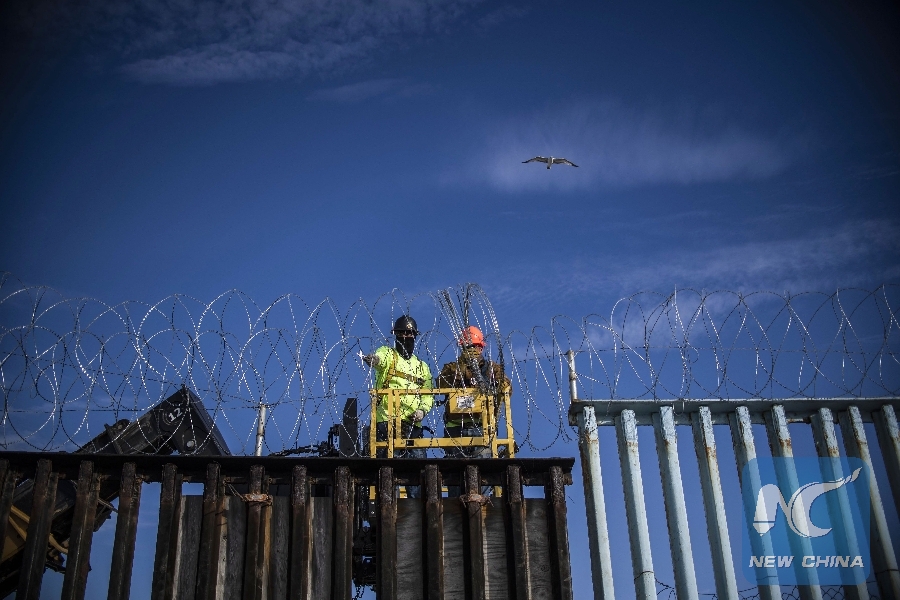 File Photo: Workers reinforce security on the U.S. side of the border fence with Mexico, as seen from Playas de Tijuana, Mexico, on Nov. 15, 2018. (Xinhua/AFP)
